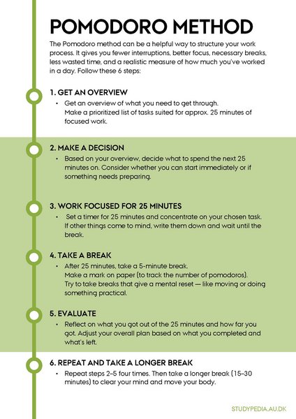 To make the most of your study time efficiently, you can try dividing your time into intervals. An effective method is the "Pomodoro" technique, where you work for 25 minutes followed by a 5-minute break (25:5). However, you can adjust the method according to your preferences, such as 45:15 or 50:10. Regardless of the time interval you choose, the key aspect of the method is having a clear purpose for the allocated time.