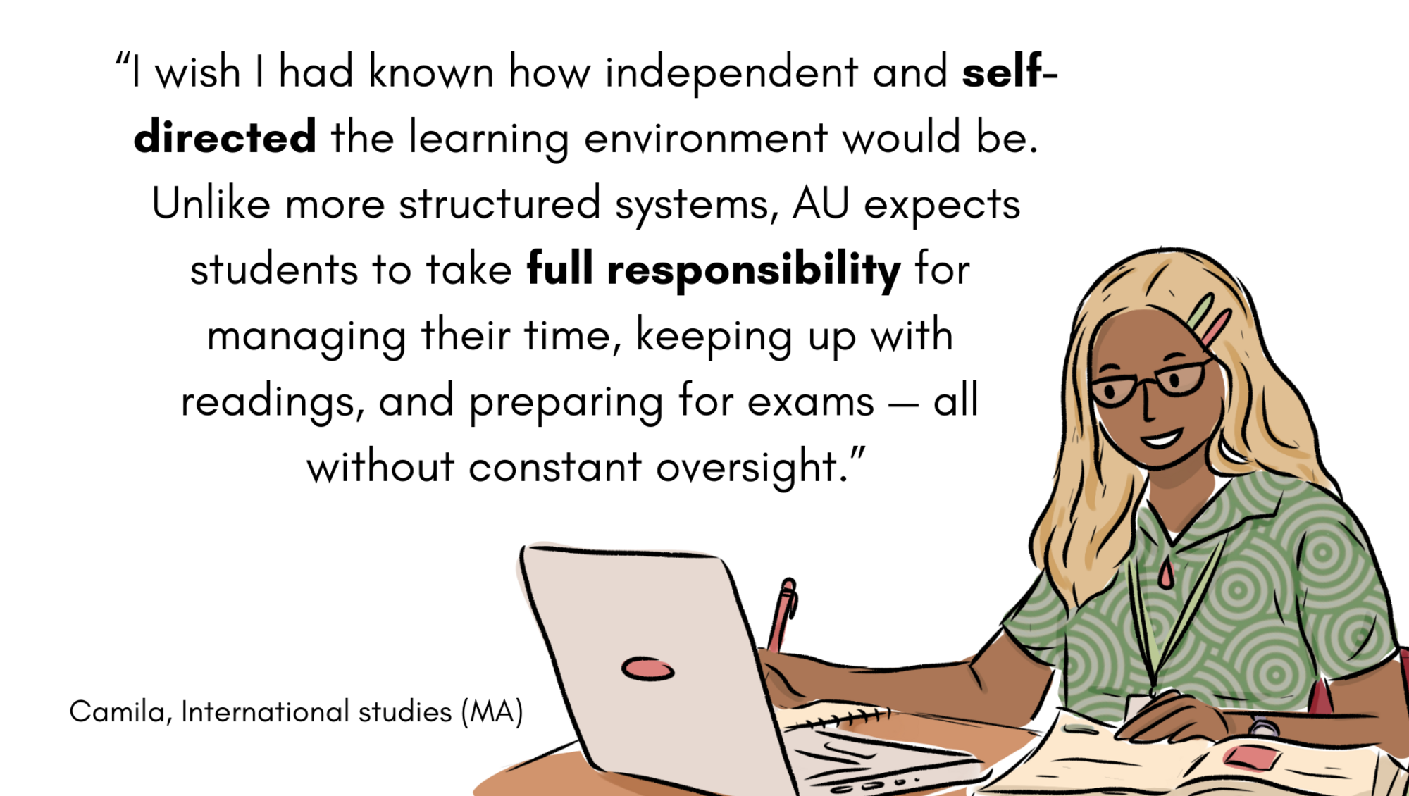 There is a lot of freedom when studying at AU, but there is a clear expectation that you read, participate in group work, make assignments, etc., during your course. There is no “homework”, but some courses may have requirements that must be fulfilled in order to take the exam. This could be handing in assignments and attending certain sessions throughout the semester. It is therefore your responsibility to manage your time and meet the programme’s requirements.