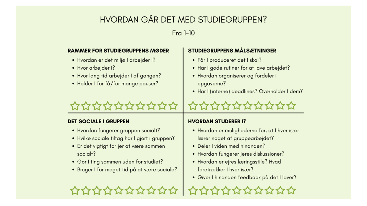 Et godt samarbejde i gruppen kræver, at I taler højt om jeres forventninger og skaber fælles rammer for, hvordan I arbejder sammen. Så ved du, hvad de andre medlemmer forventer af din deltagelse i gruppen, og du ved, hvad du kan forvente af de andre. Det styrker både det faglige udbytte og trivslen i gruppen.